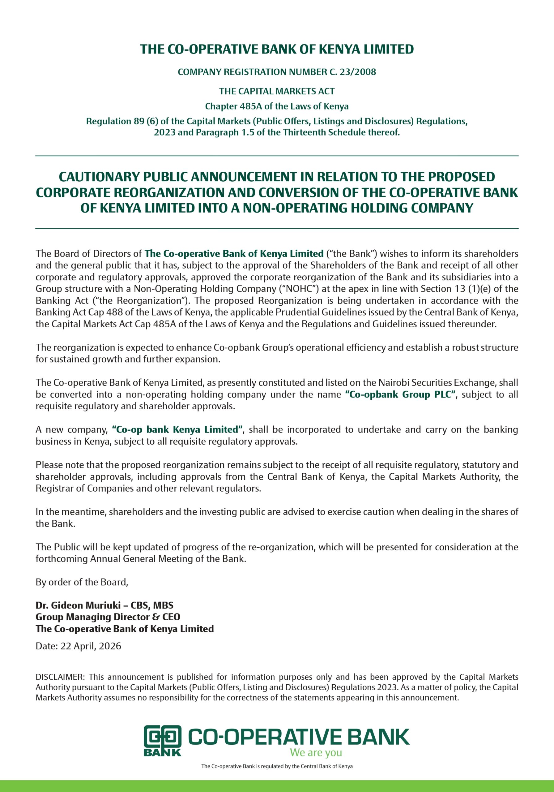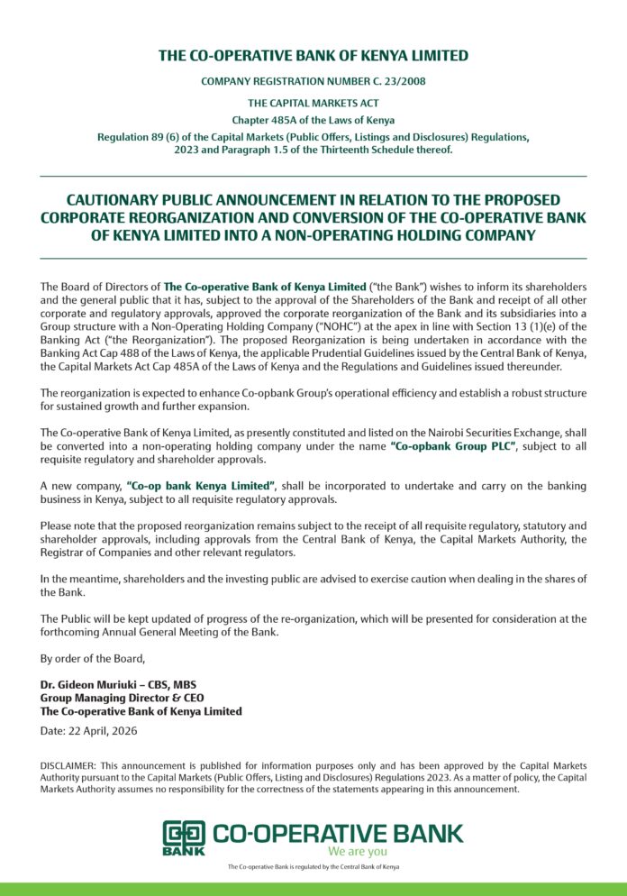 In a cautionary public announcement issued on April 22, 2026, the bank’s Board of Directors revealed that the current listed entity will be renamed Co-opbank Group PLC, subject to regulatory and shareholder approvals. Under this new architecture, a newly incorporated subsidiary, Co-op bank Kenya Limited, will be established to manage the group’s core domestic banking operations.