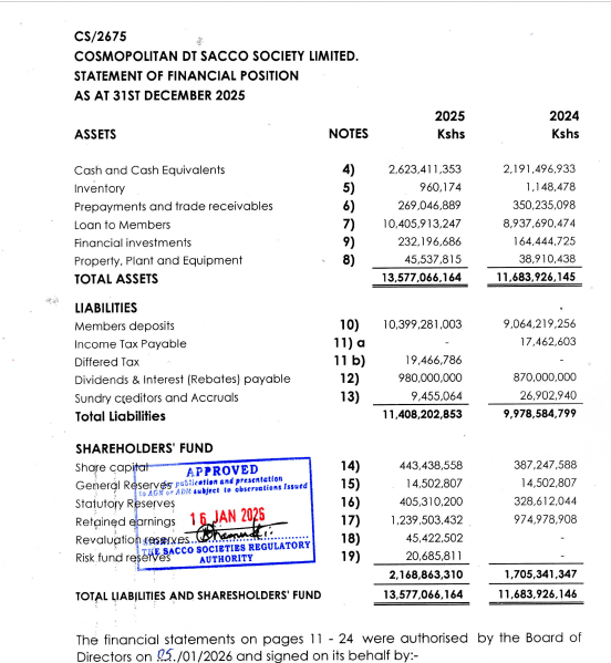 According to the audited financial statements posted on the Sacco’s website, which have been reviewed and approved by the Sacco Societies Regulatory Authority (SASRA), the Sacco recorded impressive growth across all key performance indicators. The Sacco’s total assets rose to Ksh13.58 billion in 2025, a steady climb from the Ksh11.68 billion reported in 2024. This expansion was primarily driven by a surge in credit uptake, with the total loan portfolio to members growing from Ksh8.94 billion to Ksh10.41 billion over the same period.