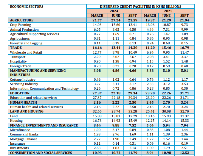 Credit disbursed to the Education sector jumped sharply to Ksh 31.71 billion in September 2025, up from Ksh 21.99 billion in June 2025. This surge, representing 24.05% of the total lending portfolio, aligns with the traditional demand for school and college fees during the third quarter.