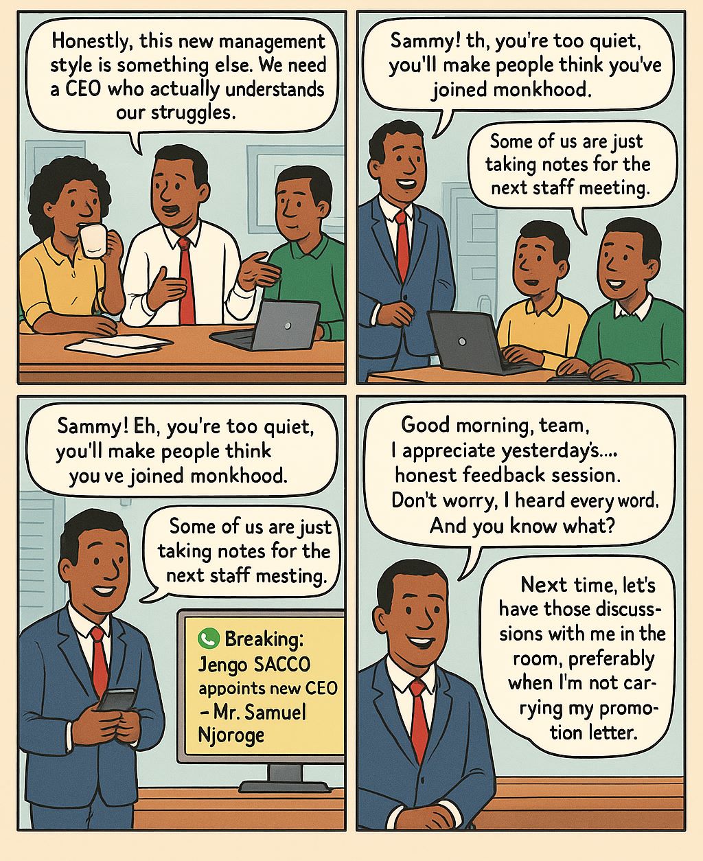 CEO Njoroge: “Good morning, team. I appreciate yesterday’s… honest feedback session. Don’t worry, I heard every word. And you know what? It was enlightening.”